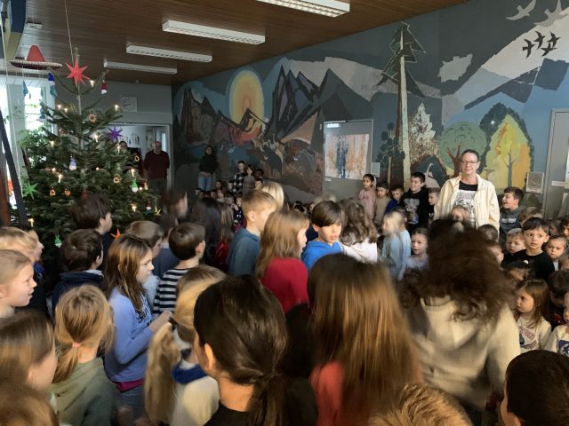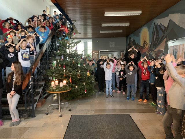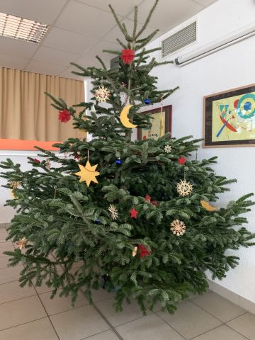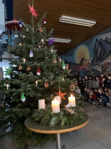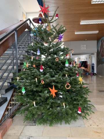 Auch in diesem Jahr wurde die Hofäckerschule wieder mit wunderschönen Christbäumen versorgt, die wir von den „Sersheimer Löwen“ und Herrn Eckert vom REWE in Vaihingen großzügigerweise erhalten haben. Sowohl der Eingangsbereich der Schule als auch unsere Mensa konnten dadurch in eine weihnachtlich-festliche Stimmung gebracht werden. Jeden Montag findet in der Adventszeit zudem gleich zu Beginn des Schultages im Eingangsbereich das traditionelle Treppenkonzert um den geschmückten Baum versammelt statt. Wir sagen dafür dankeschön!!