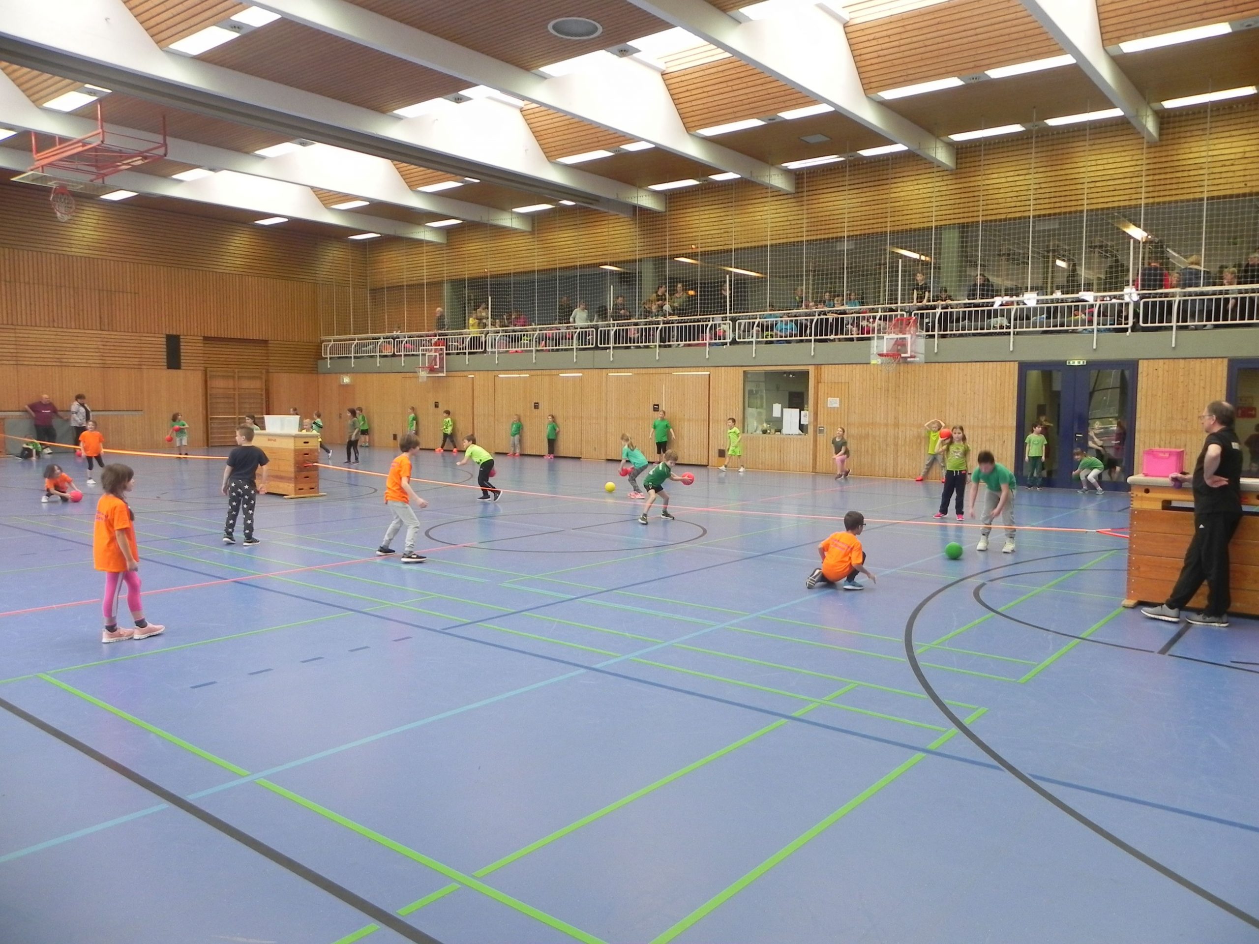 Schon früh fanden sich die Sportlehrer zum Aufbau in der Halle ein und erwarteten danach entspannt die fröhlich eintreffenden Kinder, die mit ihren Lehrerinnen und Lehrern aus der Hofäckerschule kamen.