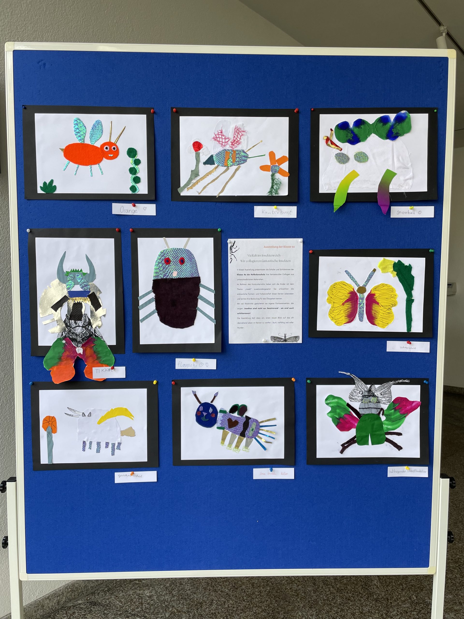 Die Klasse 4a der Hofäckerschule zeigt im Rathaus Sersheim fantasievolle Collagen zum Thema „Insekt“.